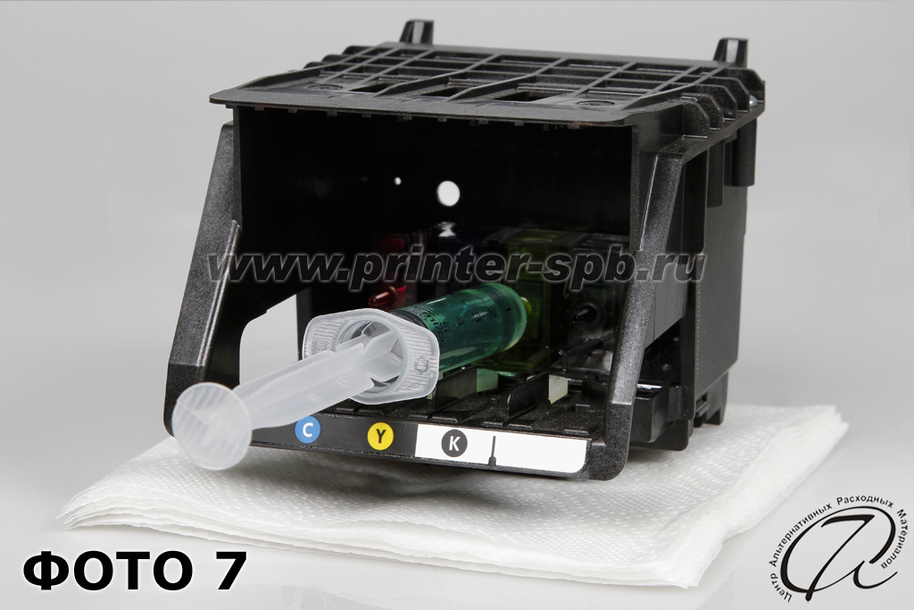 Аккуратно наденьте носик шприца на чернильный штуцер ПГ. Носик шприца должен быть одет плотно на штуцер без зазоров. Надавите на поршень шприца (несильно и не резко), чтобы вся жидкость поступила из шприца в канал, чтобы промыть его (ФОТО 7). Промывочная жидкость должна медленно вытечь на салфетку.